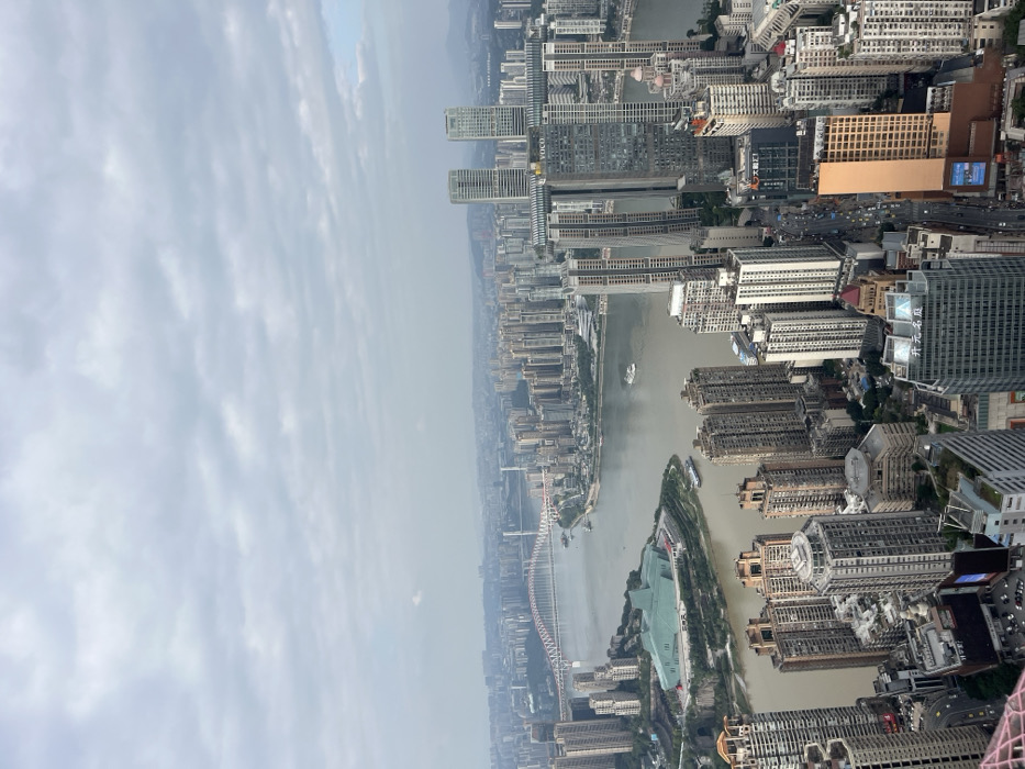 A high-angle view depicts a sprawling cityscape along a river. Numerous high-rise buildings line the riverbanks, their architecture diverse. A large bridge spans the waterway, connecting different sections of the city. The sky above is overcast with clouds, creating a muted lighting. The overall impression is of a bustling metropolis.