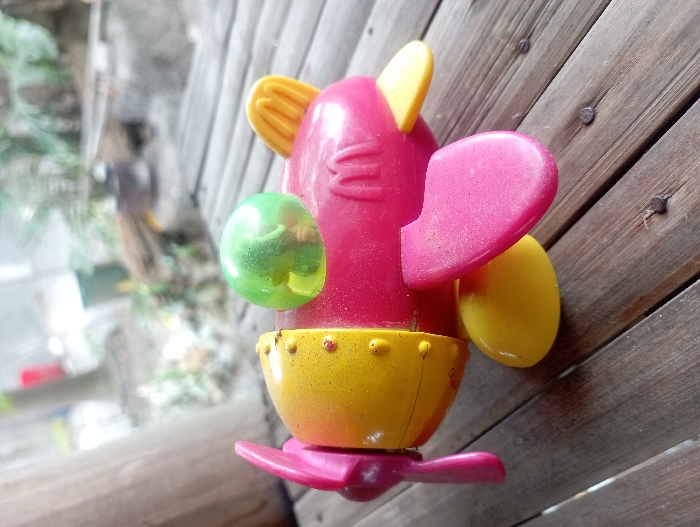 A pink and yellow toy airplane with a green, clear, bubble-shaped canopy sits on a wooden table. The airplane is facing right, with its wings slightly raised. The toy is made of plastic and has some wear and tear. The airplane is on a wooden slat table in the city of Meycauayan, Philippines (14.772, 120.99). The table is made of unfinished wood slats that have a brown-gray color. There are no other objects or people present in the image. The background is blurry, and it is difficult to determine any other details about the location. The image suggests an outdoor environment, possibly a patio or backyard.