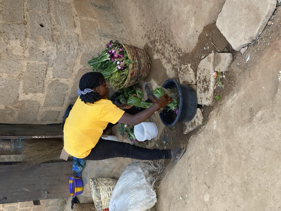 A woman in a yellow t-shirt and black pants washes green onions in a black bucket. She sits outdoors with a basket of red onions beside her. A white container, broom, basket, and a partially filled white bag are scattered on the ground nearby. The scene takes place on a stone and dirt surface, close to a rough stone wall.