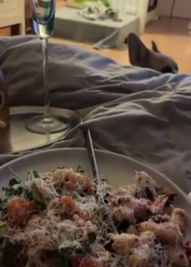 person in bed with a plate of food next to them. A glass of sparkling wine is also visible on a silver tray. The food appears to be a salad with shrimp and cheese. In the background, a small corgi dog is peeking over the edge of the bed, looking intently at the food. The dog then sits up on the bed looking at the food. The room is casually decorated.