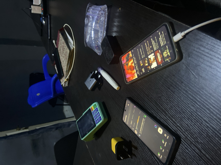 The scene, located in Alor, Nigeria, depicts a dimly lit indoor environment with multiple items arranged on a dark, textured table
