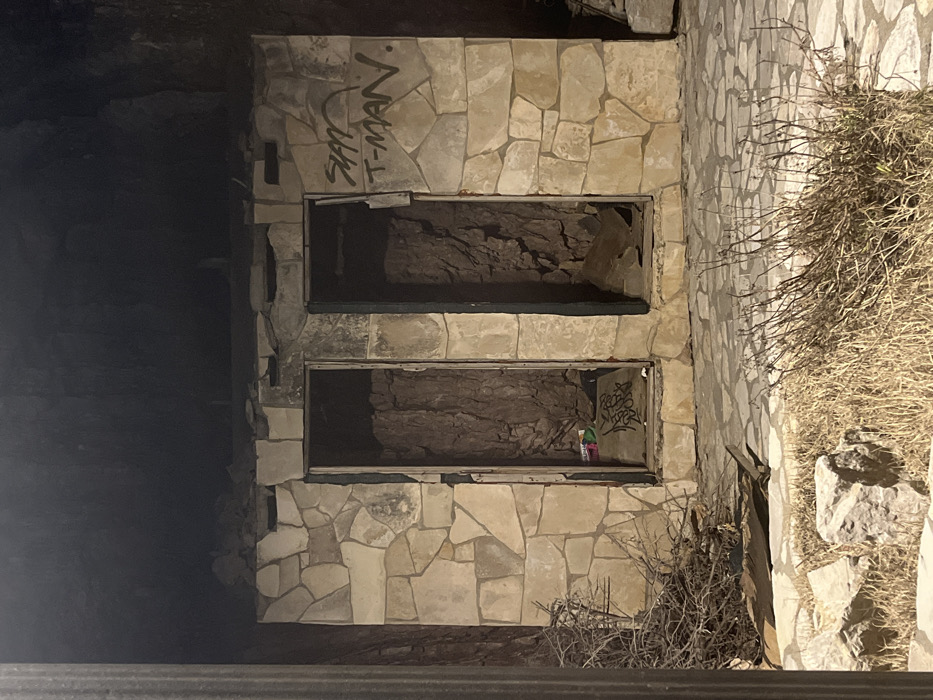 A stone facade features two dark, rectangular openings hinting at caves or hollow spaces. Graffiti adorns the stones above the top opening and beside the lower one. Dry, straw-like grass and rocks flank the right side of the structure, contrasting with the shadowy darkness dominating the left. The composition is slightly angled, adding a dynamic feel to the eerie, somewhat derelict scene.