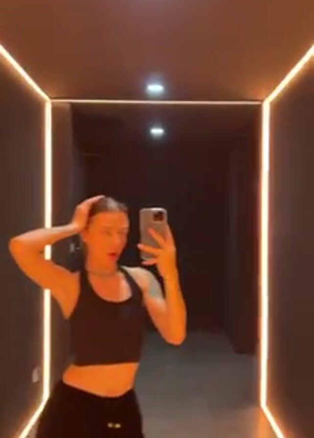 A young woman is standing in a hallway, taking a selfie in a mirror. The hallway has black walls, a gray floor, and vertical strip lighting. The woman has her hair in a ponytail. She is wearing a black crop top and black pants. She smiles slightly as she holds up her phone to take the picture.