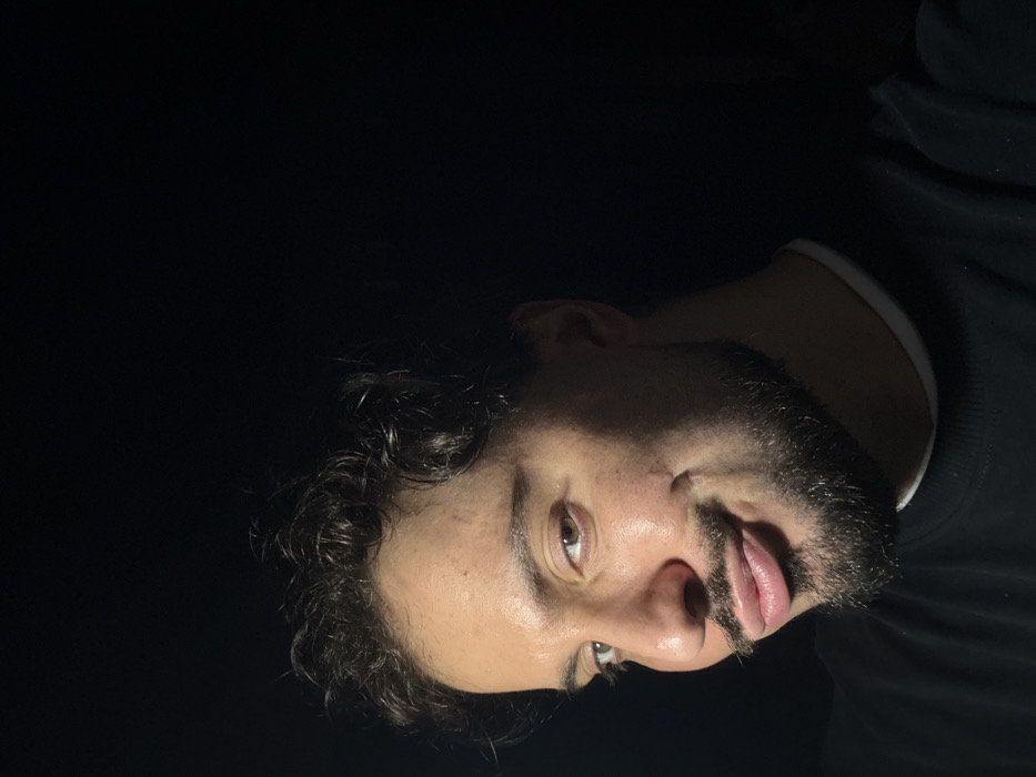 A close-up portrait shows a man with curly dark hair and a dark beard. He is wearing a black sweater with a white undershirt visible at the collar. His skin is light, and he is looking slightly down and to the left with one eye more visible than the other. The background is mostly dark, making the man's face and upper body the primary focus. The image is rotated to the side.