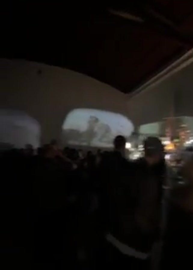 dimly lit room filled with people. Images are projected onto the walls of the room, creating a dynamic and immersive environment. People are standing around, some are silhouetted against the projections, and some moving through the space. The projections appear to be black and white film clips, interspersed with colored scenes. In the center of the room there seems to be a drum set. The room appears to be a gallery space.