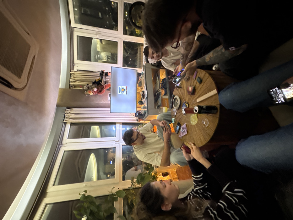 An indoor scene, likely a private residence or lounge, is depicted at night in Unknown, Unknown. At least five individuals are present, four clearly visible, gathered around a round, slatted wooden coffee table. On the left, a female with brown hair, wearing a striped long-sleeve shirt, looks down at a smartphone. Opposite her, a male wearing a light-colored t-shirt and glasses is also focused on a smartphone. To his right, another male in a white t-shirt looks towards the foreground right. In the foreground right, a male with glasses and visible arm tattoos operates a portable electronic device. The lower legs and a smartphone of a fifth individual are visible in the extreme foreground. The coffee table holds two aluminum beverage cans (one black, one red), a glass containing a yellow liquid, an ashtray with a cigarette butt, multiple smartphones/portable devices, a clear plastic cup, a small purple object (possibly a vape pen), a red and yellow box, and two wooden strips. In the background, large windows overlook a cityscape illuminated at night. A flat-screen television on a light grey console displays a logo featuring "POLARIS" and a star. Above the television, a red and brown plush toy is positioned. A green plant is visible to the left of the television. The ceiling features an air conditioning vent. The room is dimly lit, creating a casual ambiance.