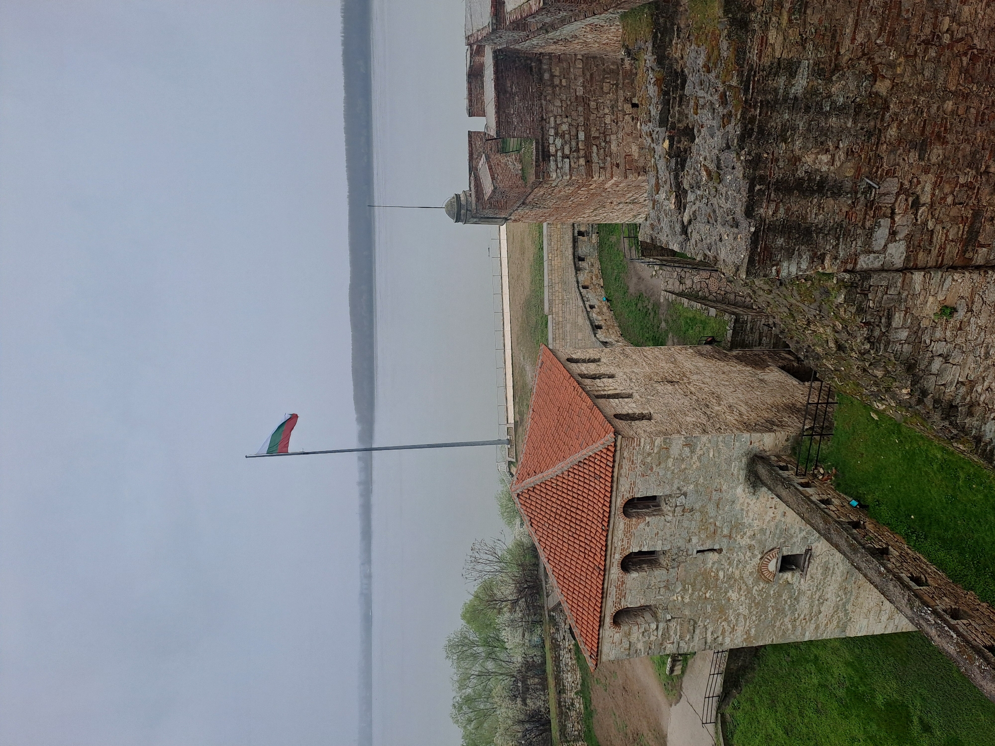 view from the Baba Vida Fortress in Vidin, Bulgaria. In the foreground is a stone building with a red-tiled roof and arched windows. A Bulgarian flag flies from a pole nearby. In the background is the Danube River and a gray, overcast sky. The fortress walls are constructed of stone. Patches of green grass are seen.