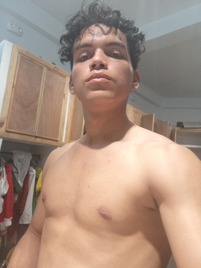 A bare-chested young man with dark, curly hair faces the camera. He stands indoors, with kitchen cabinets visible behind him. To his left, clothing hangs in a closet. The lighting is somewhat dim, casting shadows. His expression is neutral.