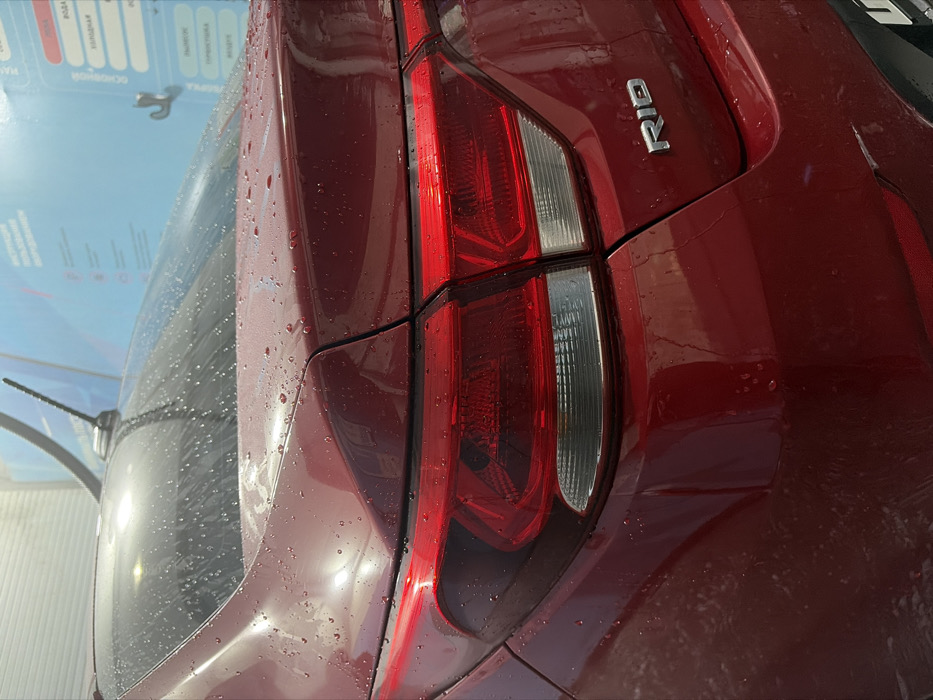 A close-up shot of a maroon Kia Rio's rear, likely in a car wash