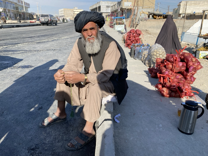 An outdoor scene in Gundigan Village (گندیگان), Afghanistan, depicts a man seated on a concrete curb beside an asphalt road, facing forward. The man, with a long white beard and dark turban, wears a light brown traditional outfit and a dark waistcoat. He holds a strand of green prayer beads (tasbih) in his hands and wears a gold-colored bracelet on his right wrist, along with open-toed sandals. To his right, numerous red mesh bags of red onions and several clear plastic bags of potatoes are arranged on the ground for sale. A person in a dark burqa is partially visible behind the produce display. Further right, a silver thermal carafe and a small glass with a yellow beverage are placed on the ground. In the background, a street with light-colored buildings, possibly shops, extends into the distance. A light-colored SUV is visible on the road. The scene is illuminated by strong sunlight, casting long shadows across the road and the man's lower body. The environment appears dusty and bustling.