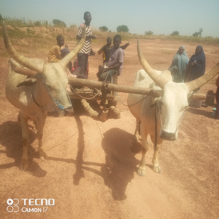 The scene depicts an open, unpaved reddish-brown dirt area under bright daylight with a clear sky, located in Unknown, Unknown. Two large white oxen with prominent, curved horns are yoked together, standing stationary and facing generally forward, attached to a rudimentary wooden cart. The ox on the left has a blue rope halter, and the ox on the right has a black rope halter. Approximately four young males are positioned around and on the cart; one in a striped shirt stands near the yoke, another in a light shirt is seated on the cart, a third in a dark shirt points to the right, and a fourth in a purple shirt is seated. In the background, two adult females wearing full-body coverings (one light blue/grey, one dark) stand. Sparse vegetation and distant trees are visible under a clear blue sky. Shadows are distinct, indicating direct overhead sunlight.