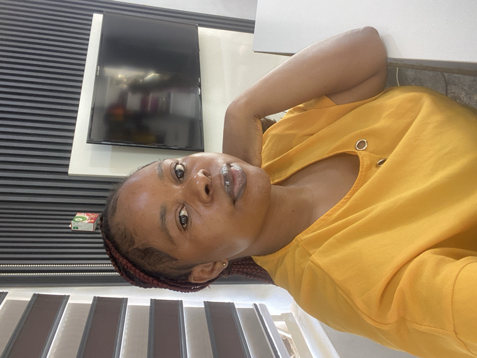 The image displays an indoor scene featuring an adult female with a dark complexion and reddish-brown braided hair, seated. She is wearing a yellow short-sleeved top with a round neckline and two visible metallic eyelets on the front. Her lips are glossy, and she has a stud earring in her visible right ear. Her right forearm rests on a white table or counter surface, with her hand positioned near the right side of her head. She is looking directly at the camera. The background wall features vertical dark striped paneling. A black flat-screen television is mounted on a white rectangular panel affixed to this wall. Above the subject's head, a small, rectangular object displaying red and green branding is partially visible on the wall. To the left of the subject, a window fitted with horizontal dark brown blinds allows ambient light into the room. The exact location within the city of Gwarinpa, Nigeria, is not discernible from the visual information provided in the image.