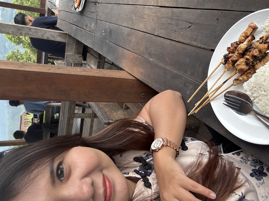 The image depicts a semi-outdoor dining scene in Selotapak, Indonesia. In the foreground, positioned to the left, an adult female with long, dark brown hair and wearing a light-colored top with a dark floral pattern and frog fastenings smiles towards the viewer. A rose gold-toned watch with a mesh band is visible on her left wrist. Her left arm rests on a dark wooden plank table that occupies the center and right of the frame. On the table, a white round plate holds a serving of white rice and six skewers of grilled meat, likely satay, accompanied by a silver fork and spoon. A small, orange dish is partially visible further down the table to the right. The background reveals additional dark wooden tables and benches, with three adult males seated at different tables. Two males are visible on the left, facing away, one in a dark shirt and the other in a light blue shirt. A third male in a dark shirt is seated further right, also facing away. A prominent vertical wooden support beam stands to the left of the center. Beyond the dining area, a lush green mountainous landscape is visible under an overcast sky, consistent with an elevated scenic location.