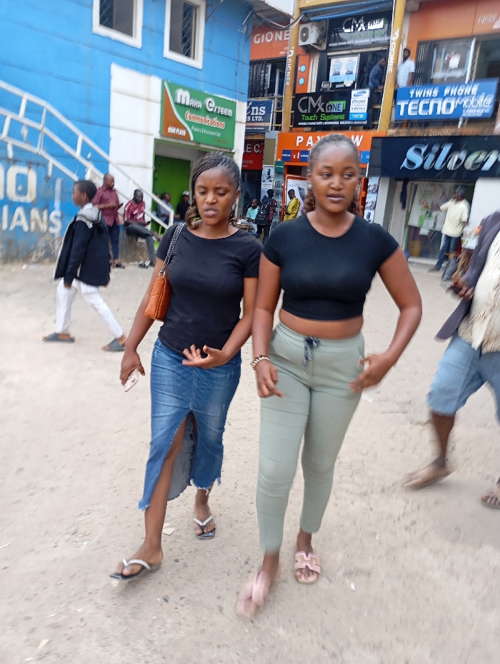 Two young women walk along a street lined with storefronts. The woman on the left wears a black t-shirt, denim skirt with a high slit, and sandals, carrying a brown purse. The woman on the right has on a black crop top, light green pants, and pink sandals. Behind them are several people and various businesses with signage. The buildings display signs for "MAKA CITEEM," "TWINS PHONE," "TECNO MOBILE," and "Silver." The street appears to be unpaved.