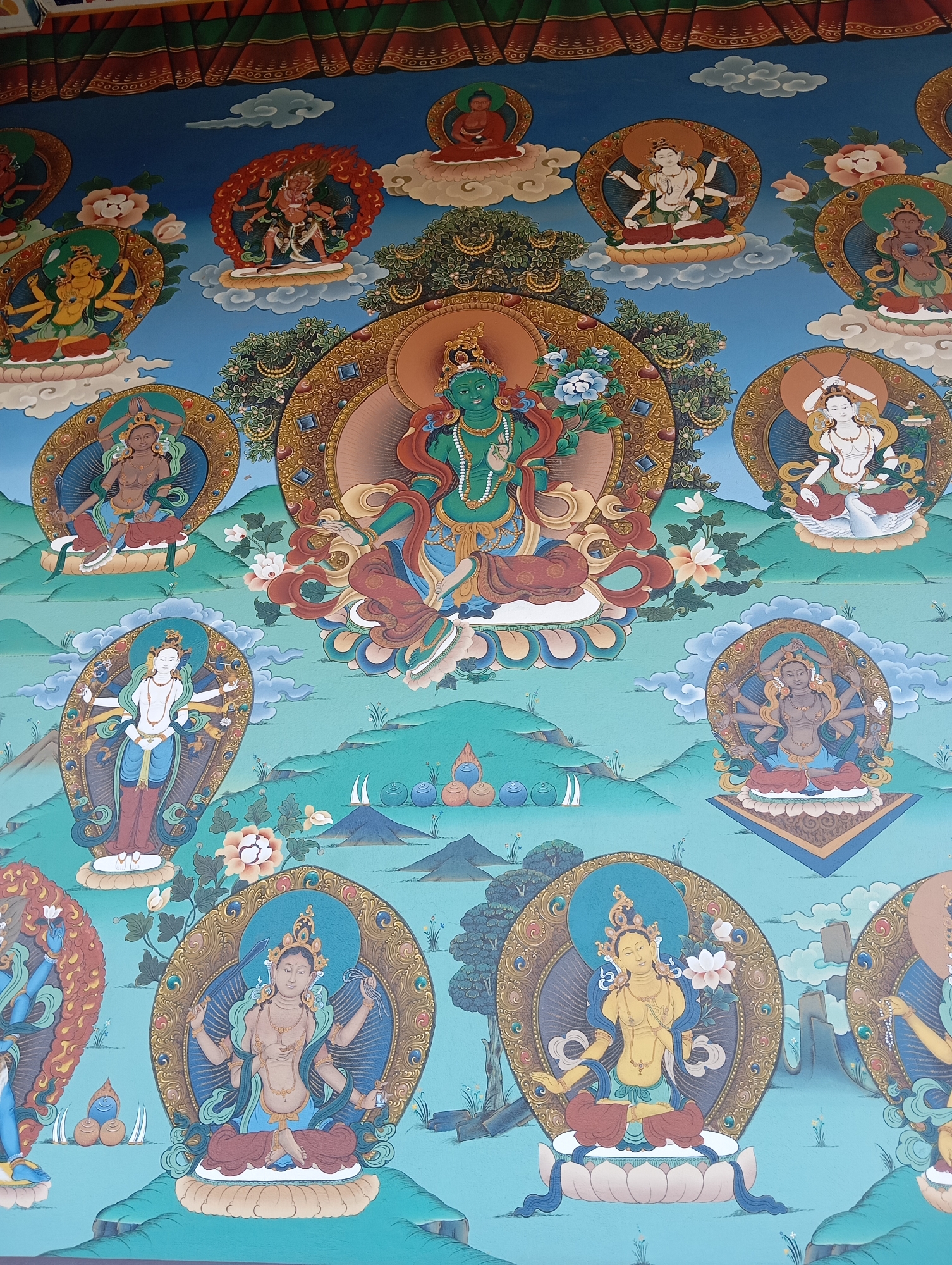 The image is a close-up shot of a traditional mural depicting various deities, likely Buddhist or Hindu