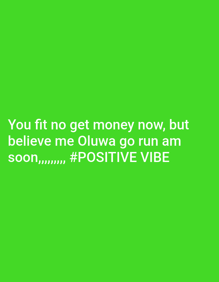 This image is a digital graphic featuring white text against a solid, vibrant lime green background. The text, centered horizontally and positioned in the lower-middle portion of the frame, reads: "You fit no get money now, but believe me Oluwa go run am soon,,,,,,,,, #POSITIVE VIBE". There are no discernible people, objects other than the text, or specific actions depicted. The environment is entirely digital, without any elements suggesting a physical location within the city of Unknown, Unknown.