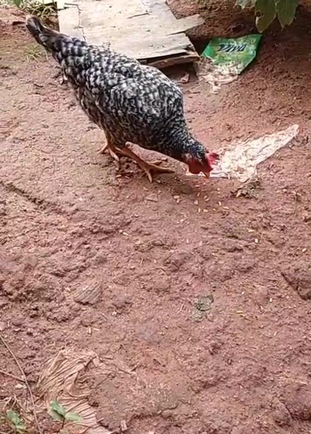A chicken with black and white speckled feathers is pecking at grains scattered on red-brown earth. Behind the chicken are some pieces of wood, a green plastic bag, and some green foliage. There is also some litter on the ground.
