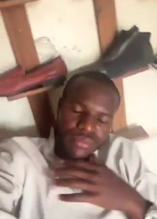 man indoors, seemingly posing in front of a shoe rack. The shoe rack has several pairs of shoes on it, displayed on small wooden shelves. The man is wearing a light-colored shirt and a watch. He looks directly at the camera. He starts with a slightly surprised expression, touches his chest, and then rests his head on his hand, appearing contemplative. The background is a light-colored wall on which the shoe rack is mounted.