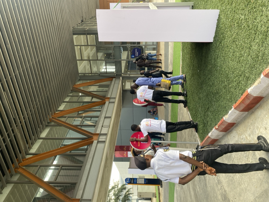 This image depicts an outdoor public space adjacent to a modern, multi-story building in Alaguntan, Nigeria