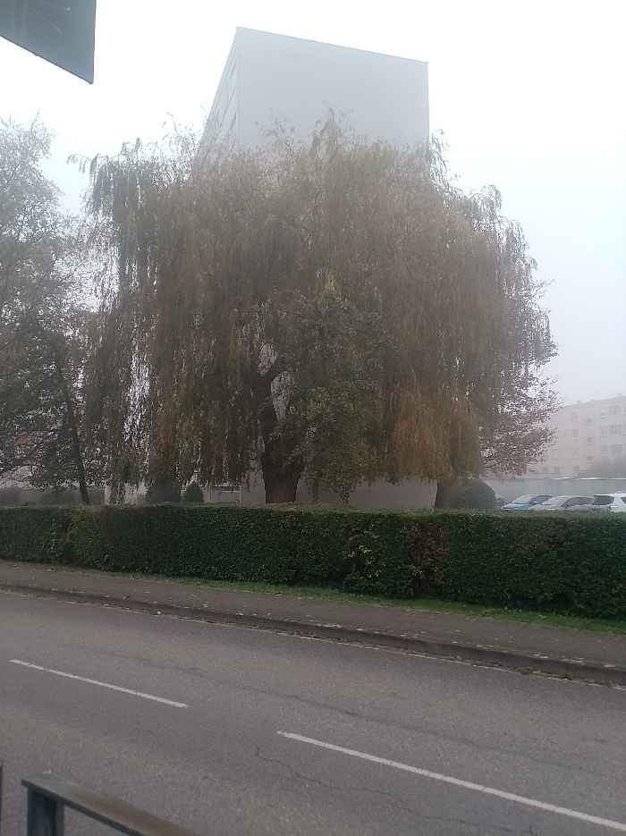 The image depicts a foggy outdoor scene in an urban or suburban environment at an unknown location. The foreground features a two-lane asphalt road with faded white dashed lane markings, bordered by a concrete curb and a dark metal railing partially visible in the bottom left. Separating the road from the background is a dense, well-maintained green hedge running horizontally across the midground. Behind the hedge, a large weeping willow tree dominates the center of the frame, its long, yellowish-green branches drooping towards the ground. Other deciduous trees with less dense foliage are visible to the left and right of the willow, partially obscured by the fog. In the background, a tall, light-colored, rectangular building with minimal visible features rises behind the willow tree, its upper sections fading into the dense white fog. To the far right, another multi-story residential-style building with a lighter, possibly pinkish-beige facade and visible windows is discernible through the fog, with several parked vehicles (sedans, SUVs) in front of it, behind the hedge line. The entire scene is enveloped in thick fog, resulting in diffused lighting and significantly reduced visibility, creating an overcast and muted atmosphere. No people are visible.