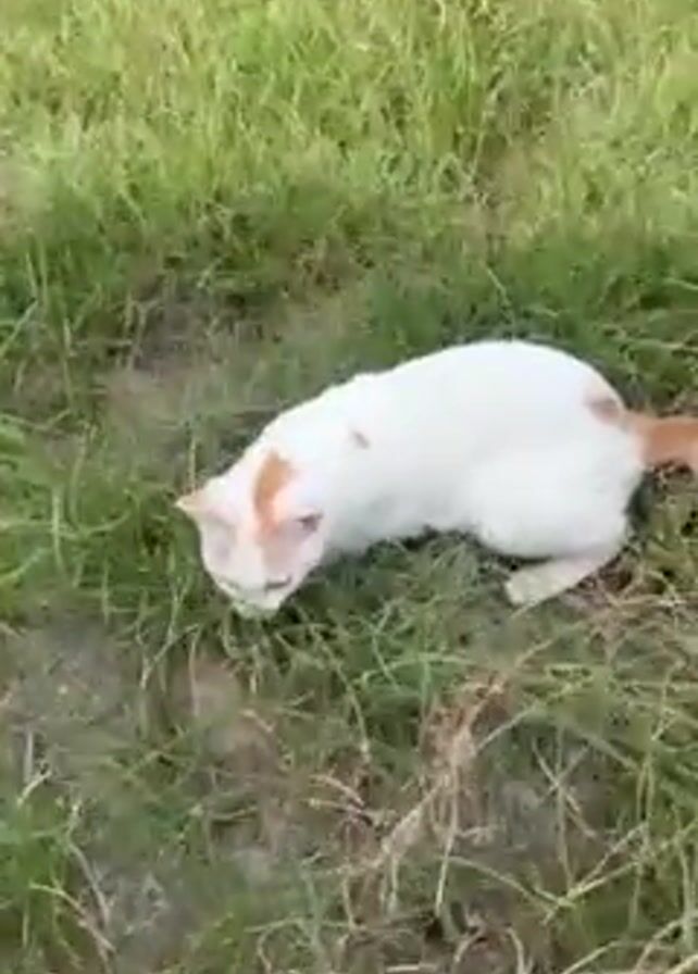 white cat with orange markings crouching in a grassy area. The cat then runs away from the camera and towards a gate made of concrete and chain link fencing. The cat runs over a path of stepping stones made of concrete. The area is partially dirt with patches of grass.