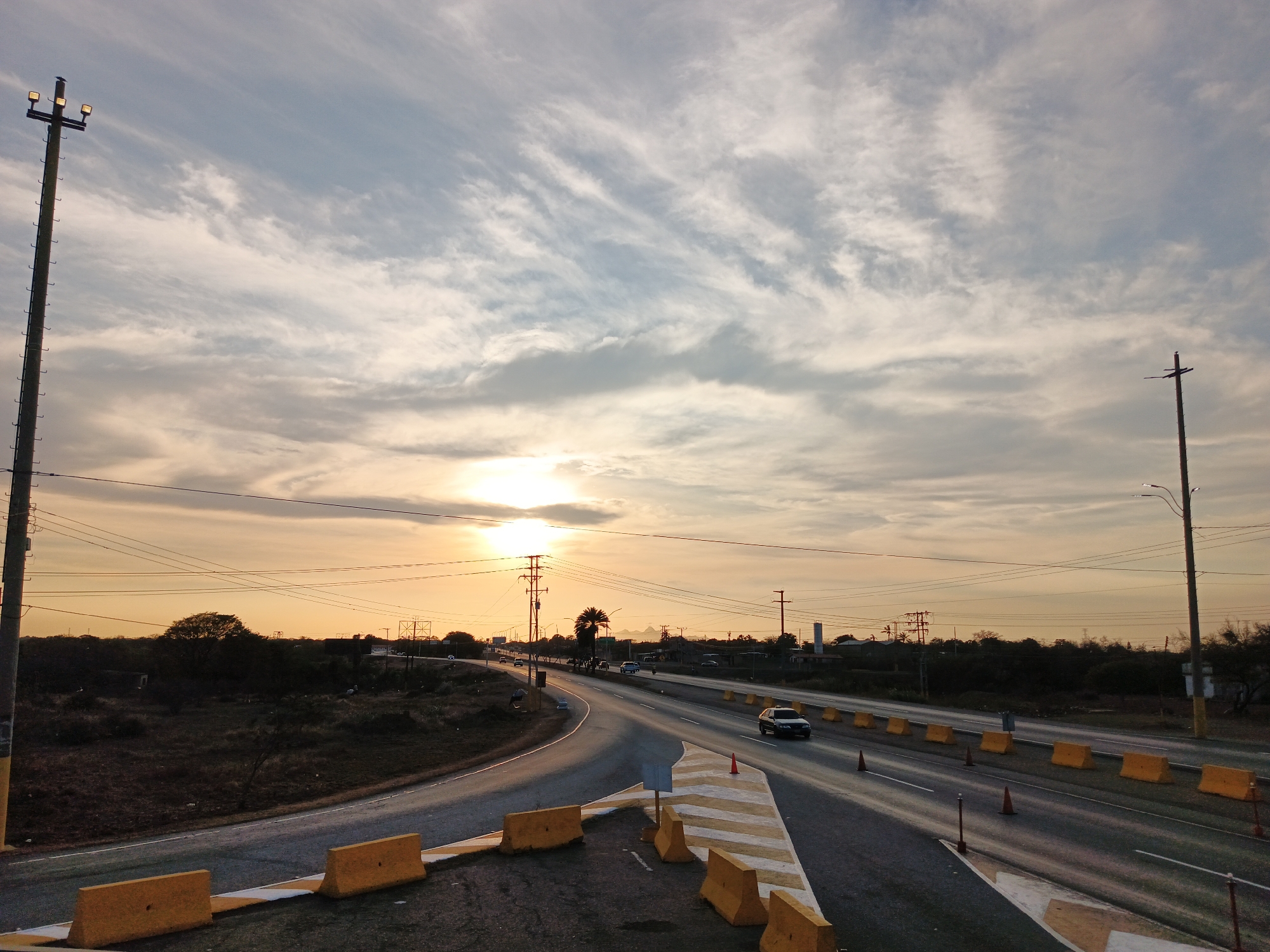 road in what is likely El Dátil, Venezuela, based on the environment. A four-lane road curves to the left. The road is marked with yellow and white barriers. Orange cones are spaced alongside the road. Power lines stretch across the sky above. The sun is setting. There are a few cars on the road. The vegetation looks dry and sparse. There are light poles on both sides of the road.