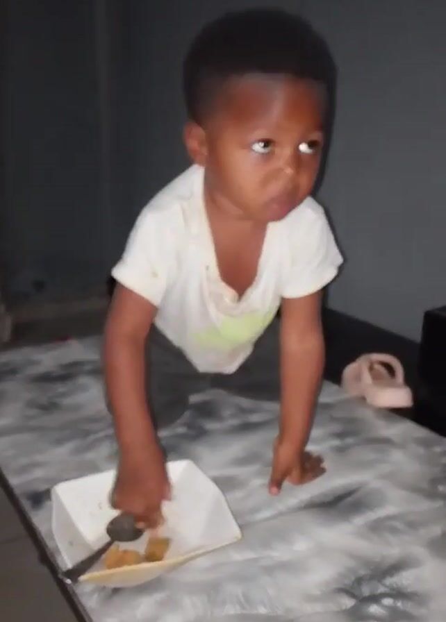 A small child kneels on a black and white textured table, eating food from a white container with a spoon in it. The child is dark-skinned and wearing a white t-shirt and gray pants. The room appears to be dimly lit. The child looks up at something out of frame while eating. A pair of sandals sit beside the child on the table. There is a shadow of a person filming in the video's upper left corner. Background music is audible.