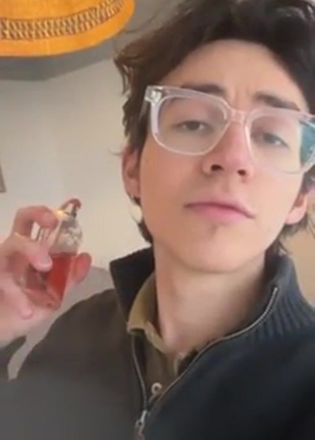A person with dark hair and wearing transparent glasses holds a small glass bottle with a dark liquid inside in their left hand. The person sprays the bottle in the air. The person wears a black zip-up jacket over a tan collared shirt. The person is indoors. Above is a straw-like light fixture.