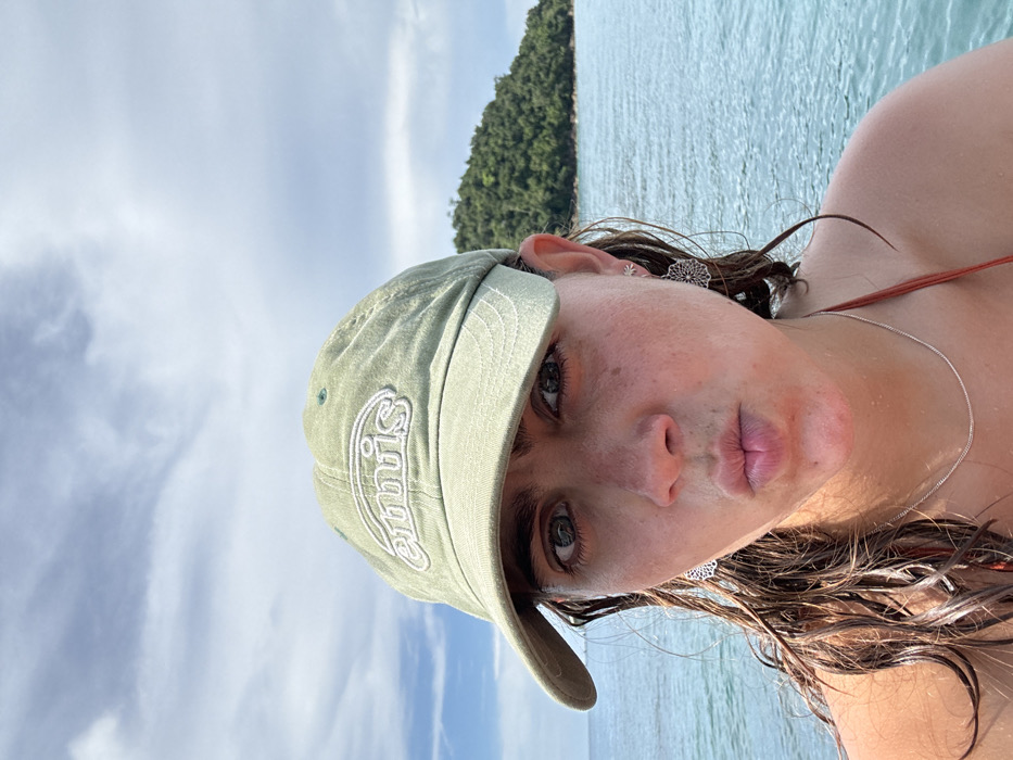 A close-up portrait features a female subject in the coastal waters of Ko Tarutao, Thailand. She is positioned centrally, facing forward with her lips puckered and eyes wide open. She wears a faded olive green baseball cap with "emmis" embroidered in white on the front. Her dark brown hair, wet and appearing to extend from beneath the cap, frames her face. On her visible right ear, she wears a small silver stud and a larger, intricate silver filigree dangle earring. A thin silver chain necklace is visible on her neck, and she is wearing a reddish-brown bikini top. The background shows rippled blue-green ocean water, with a densely forested island visible to the right in the middle distance. The sky above is partly cloudy with patches of blue.