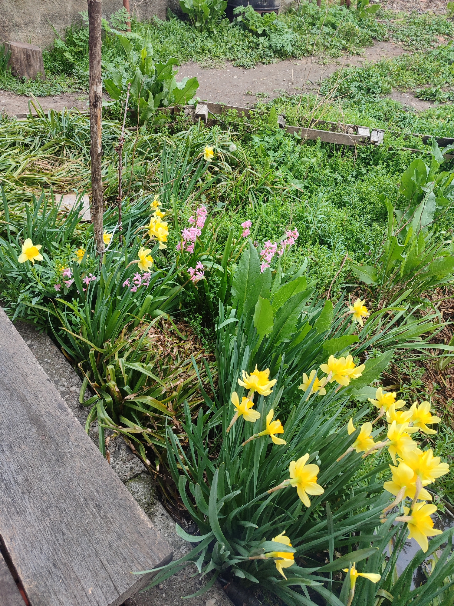 The image captures a garden scene in Burgas, Bulgaria. A weathered wooden bench is visible in the foreground, adjacent to a flower bed. This bed contains a variety of flowering plants, including prominent groupings of bright yellow daffodils and clusters of pink hyacinths. The flowers are interspersed with green foliage. Behind the flower bed, the garden features an area of mixed vegetation including grasses, weeds, and larger-leaved plants. A thin, wooden stake stands among the flowers. The garden surface consists of soil and gravel paths. The background includes a section of weathered concrete wall or structure and an area with additional green vegetation and possible gardening debris.