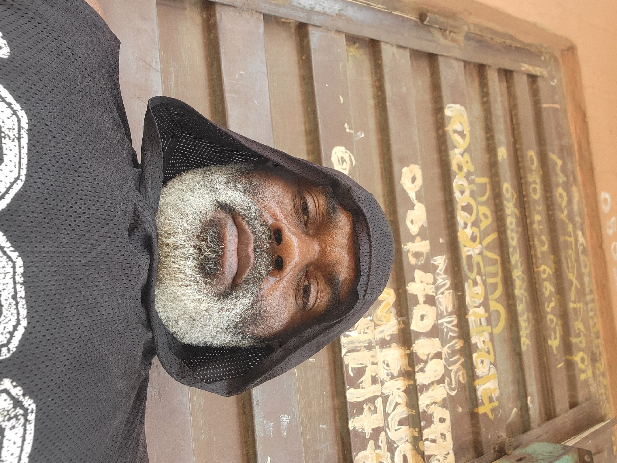 A man with a grey beard and wearing a black hooded shirt stands in front of a corrugated metal door in Maiburiji, Nigeria. The door is painted brown with yellow and white graffiti. The man's face is the primary subject of the image, and he is looking directly at the camera.