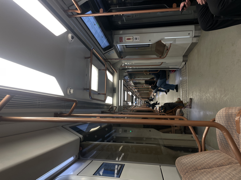 Inside a train car, rows of seats line the sides of a central aisle. Passengers are seated, some with luggage at their feet. Windows and bright ceiling lights illuminate the interior. Above the seats are handrails. The color scheme is mostly beige and gray, with copper-colored handrails. A security camera is visible near the ceiling. The perspective makes the train car appear long and narrow.