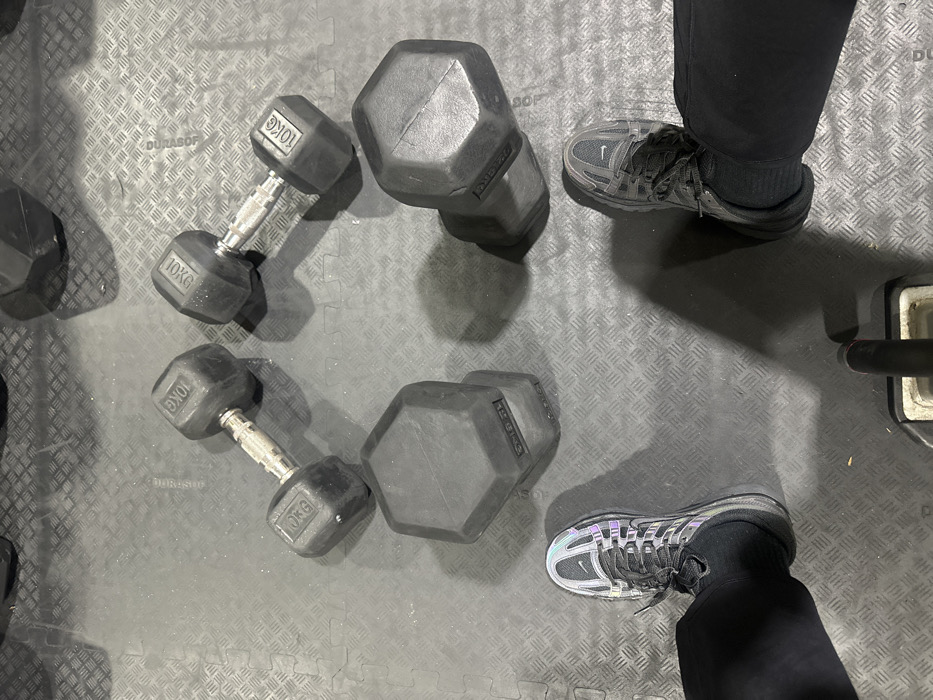 The image presents a top-down view of a gym floor in Tunbridge Wells, United Kingdom. The dark grey interlocking rubber floor mats feature a diamond plate texture, with the brand "DURAFOOOR" faintly visible. Four hexagonal rubber-coated dumbbells are positioned on the matting: two 10kg dumbbells with chrome handles are in the upper frame, and two larger 20kg dumbbells are in the mid-frame. The lower extremities of an individual are visible, suggesting a seated or resting position. The left leg is clad in black trousers and a black sock, ending in a reflective, iridescent Nike athletic shoe. The right leg is similarly dressed in black trousers and a black sock, concluding with a dark grey Nike athletic shoe. A segment of a black and white piece of gym equipment, possibly a bench, is visible at the bottom center. The scene captures a static moment within a gym environment.
