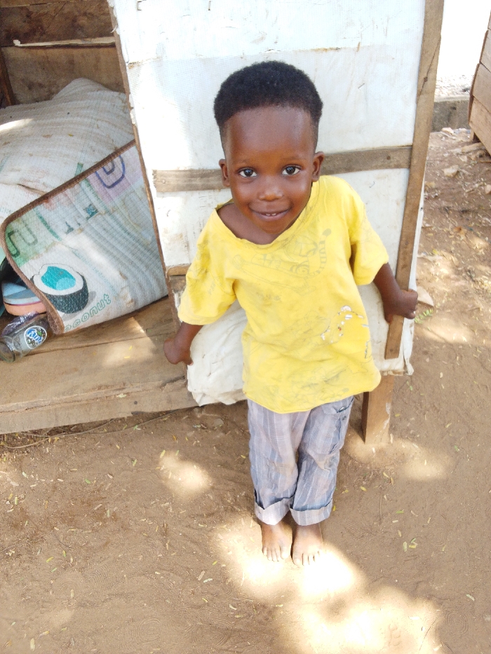 In Adankolo, Nigeria, a young child, approximately 3-5 years of age, stands barefoot on light brown sandy soil. The child has dark skin and short, dark, closely-cropped hair. They are dressed in an oversized, faded yellow short-sleeved t-shirt with faint printed designs and light blue and white striped trousers, which are cuffed above the ankles. The child looks directly at the viewer, exhibiting a closed-mouth smile. Their arms are slightly bent, with hands resting on or against a white fabric item positioned behind them and a vertical wooden beam to their right. Behind the child to the left is a rudimentary wooden structure, constructed with light-colored panels. Within this structure, a large white sack is partially visible, along with a patterned mat featuring a "coconut" design and several small, multi-colored objects. The scene is illuminated by strong sunlight, casting defined shadows on the ground, which also contains scattered small leaves and debris.