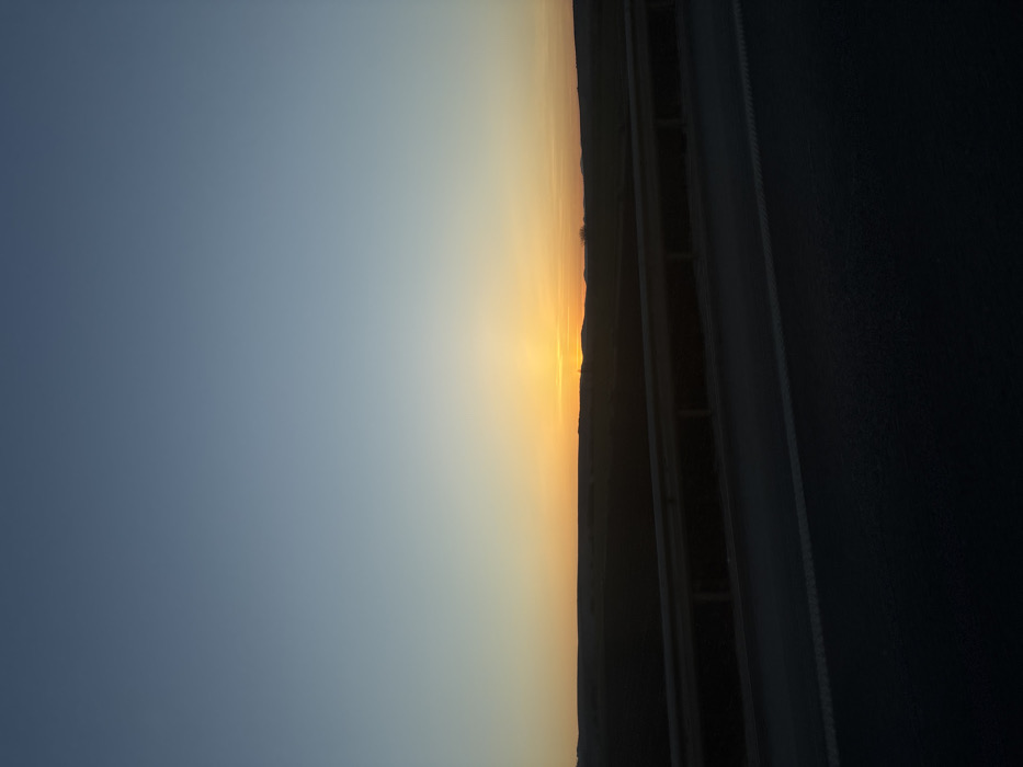 The image displays an outdoor rural scene at dusk or dawn, located in Hrabarsko, Bulgaria. The upper two-thirds of the frame present a clear sky exhibiting a gradient from dark blue at the top, transitioning to lighter blue, and then to a prominent orange-yellow hue along the horizon, indicative of the sun's position. The sun itself is visible as an intense orange-yellow light band centered on the horizon line. The middle ground consists of a dark, silhouetted landscape, consistent with distant fields or rolling hills, offering minimal discernible detail. In the foreground, an asphalt road surface occupies the bottom quarter of the frame, extending horizontally across the width of the image. A white solid line is visible on the road surface, parallel to a metallic guardrail positioned between the road and the distant landscape. The guardrail, a multi-beam barrier, runs horizontally across the lower middle section of the frame. No individuals, vehicles, or other subjects are visible, and no actions or interactions are depicted.