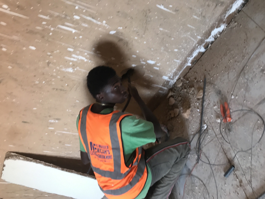 A worker wearing a bright orange vest over a green shirt is drilling into a wall. He is kneeling, focused on his task. The wall appears to be under construction, with white markings and debris scattered around. Tools and wires are visible on the ground nearby. The vest has the word "MICAH'S" along with other text on it.