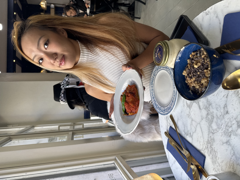 The image depicts an interior scene within a cafe or restaurant located in Rome, Italy. A young East Asian female, with long, light brown hair and wearing a white ribbed sleeveless turtleneck, is the central subject, positioned slightly right of center. She looks directly at the camera with a neutral expression, holding a white, scalloped-edge plate in both hands. The plate contains a portion of a red-sauced dish, likely baked vegetables such as eggplant, garnished with a single green basil leaf. The woman is seated at a white table with a grey marble pattern. On the table, from left to right, are: a dark blue napkin with a gold-colored fork, knife, and spoon resting on it; an empty white plate with a blue decorative rim; a dark blue bowl filled with a mixture of granola, nuts, and chocolate chips; and a lidded glass jar containing a white substance, likely yogurt, placed on a small black tray. A gold-colored spoon is also visible to the right of the bowl. The background reveals a brightly lit interior. To the immediate left, large white-framed windows reflect distorted text. Behind the primary subject and to the left, another patron is seated with their back partially to the camera, wearing a black fedora adorned with a white keffiyeh-patterned scarf. Further back on the right, an additional blurry figure is visible. The establishment features dark blue walls and overhead metallic light fixtures.