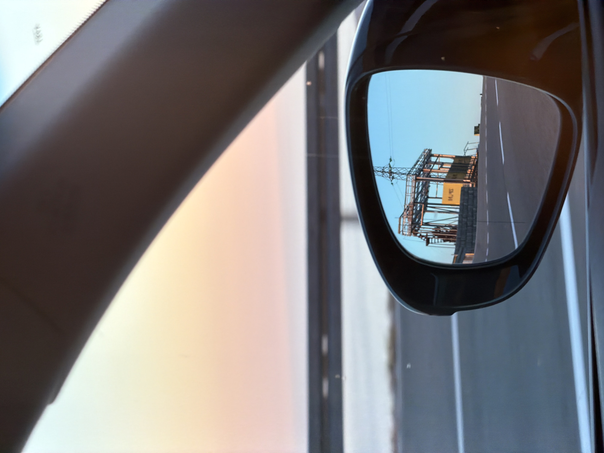 - "side view mirror of a vehicle, reflecting a roadside industrial facility" by FM-IXUoX2, licensed under CC BY 4.0