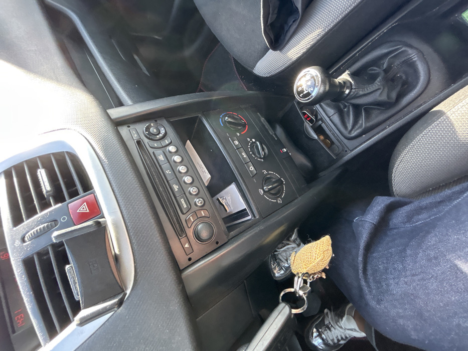 The image depicts the interior of a vehicle, specifically the dashboard, center console, and a partial view of the driver's left leg and the passenger seat. The specific location of La Fouillouse, France, is not visually verifiable within the frame. The environment is a car interior during daylight, indicated by bright sunlight illuminating the cabin, causing some glare on the upper dashboard and passenger seat. Dust is visible on the dark, textured plastic surfaces of the dashboard. **Key Subjects and Objects:** * **Dashboard Upper Section:** A digital display shows "14:31" and "16°C". Central air vents are visible, with a black smartphone mount clip attached to one of the vertical slats. A red triangular hazard warning button is located next to the mount. * **Center Console:** * **Upper Panel:** Features a car stereo unit with multiple buttons, including "SOURCE" and "BAND," and a circular knob on the left. * **Middle Section:** An open storage compartment below the stereo contains a white card, possibly a credit or ID card, and a small silver-colored object. * **Lower Panel:** Contains three circular climate control knobs (temperature, fan speed, air direction) and additional buttons. * **Below Center Console:** An open recess holds a red-illuminated USB charging adapter and what appear to be several coins. * **Gear Shifter:** A manual transmission gear stick with a black knob is visible on the right, indicating gear positions (1st, 2nd, 3rd, 4th, 5th, Reverse). The gear gaiter is black. * **Driver's Area:** The left leg of an individual is partially visible, clad in dark blue denim jeans. A dark shoe with light laces/trim is worn on the left foot. A set of car keys with a large, textured, light brown/gold, ovate-shaped keychain (resembling an owl) hangs from the ignition or a nearby hook. * **Passenger Seat:** The right side of the image reveals a portion of a gray, patterned fabric passenger seat, upon which a dark fabric object (possibly clothing) is resting. No direct human interaction or specific actions are depicted, the scene is static. The vehicle appears to be a Peugeot 207 based on the visible interior components.