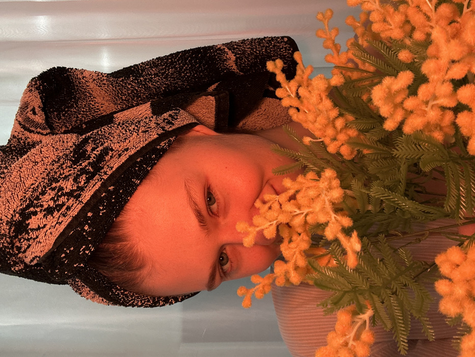 A female subject is depicted in a close-up portrait, located in Matyushino, Russia. Her face is illuminated by a strong orange-red light, presenting a subtle smile. Her light-colored eyes are directed forward. A black and peach-patterned terry towel is wrapped around her head, securing her hair. She wears a light-colored, vertically striped garment, visible on her upper torso. The subject holds a bouquet of artificial mimosa-like flowers, featuring numerous small, spherical orange-yellow blossoms and green feathery leaves, positioned in front of her lower face, partially obscuring her mouth and nose. The background consists of a light-colored, possibly white or pale blue, fabric or wall with vertical folds, appearing to be lit separately with a cooler light.