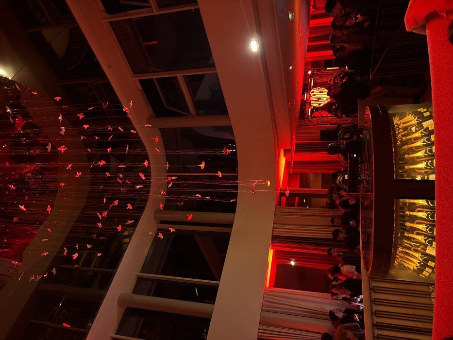n interior space with a multi-story atrium. Red lighting accentuates a modern architectural design. A decorative art installation resembling floating jellyfish is suspended from the ceiling. The scene also includes a bar area where patrons are gathered. A display case filled with champagne bottles is visible near the bar. The overall atmosphere suggests a stylish and vibrant social setting.