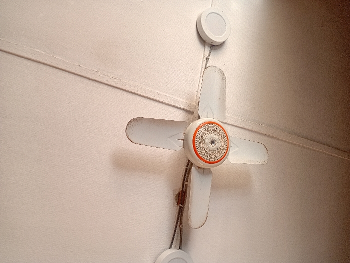 The image depicts an indoor ceiling view in the city of Lagos, Nigeria. A stationary, four-bladed white ceiling fan is centrally mounted on a light-colored, textured ceiling. The fan's central hub features an orange outer ring and a white and grey patterned, perforated core. Exposed grey electrical wiring connects the fan's mounting bracket to two circular, white, flush-mounted light fixtures positioned to the left and right of the fan. The ceiling exhibits a diagonal raised seam extending from the lower center towards the upper right, along with minor surface imperfections and dust accumulation, particularly around the fan and light fixtures. Shadows from the fan blades are visible on the ceiling surface. There are no people, actions, or interactions present in the scene.