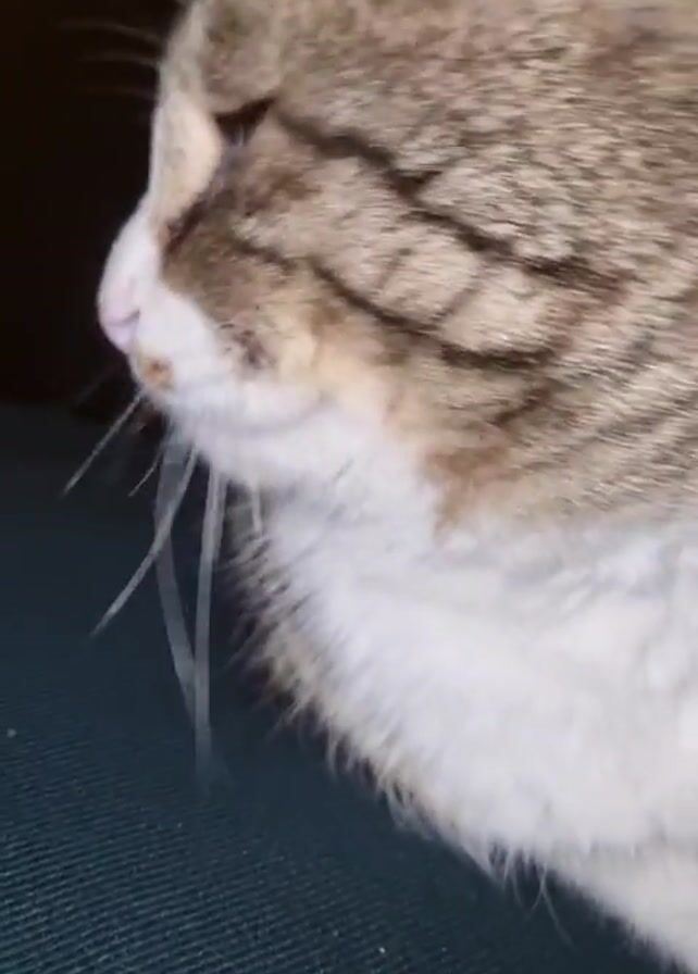 A close-up shot focuses on the face of a tabby cat with a white chest. The cat has closed eyes, appearing sleepy. The background is dark and out of focus.