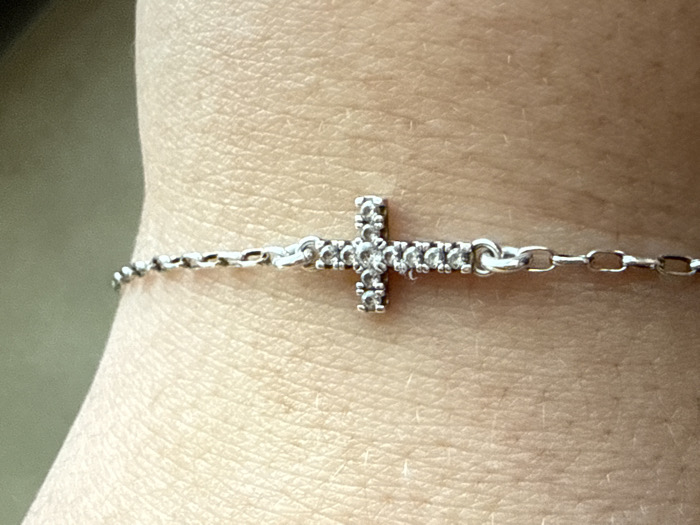 The image displays a close-up view of a light-toned human wrist or forearm, located in Veliki Preslav, Bulgaria. A silver-colored chain bracelet is worn on the skin. The bracelet features a delicate link chain with a central cross-shaped charm. The cross is intricately set with multiple small, clear, reflective stones. The skin surface displays typical texture and pores. The background is an out-of-focus, muted green-grey.