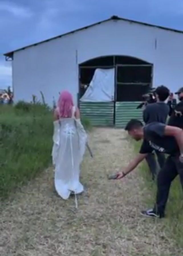 A video shows a person dressed in a white, ornate dress and pink hair walking away from the camera towards a white barn