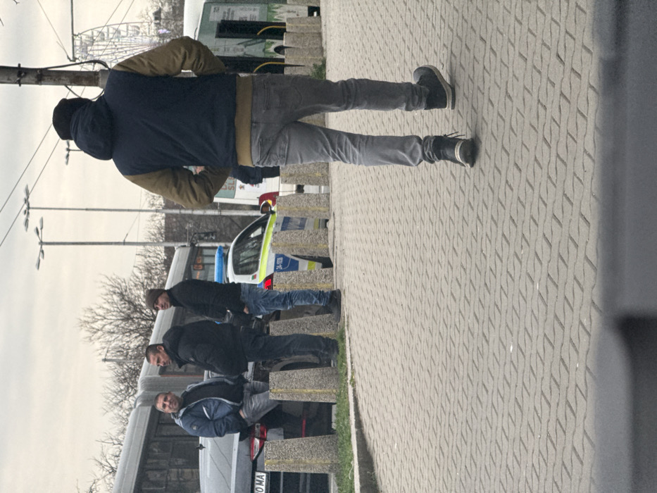 The image depicts an urban street scene in Sofia, Bulgaria, characterized by an overcast sky. In the foreground, a male subject is observed from behind, walking towards the right side of the frame on a grey sidewalk paved with rectangular interlocking pavers. He wears a dark blue hooded jacket with khaki sleeves, grey jeans, and dark shoes. In the mid-ground, a row of grey concrete bollards separates the sidewalk from a road. To the left, three adult males are visible. The leftmost man, wearing a light blue jacket and grey jeans, leans against the rear of a dark grey sedan. The sedan displays a partial Bulgarian license plate, "CB 20 MA," indicating Sofia registration. The central man wears a black puffer jacket and dark trousers, standing upright. The third man, positioned to the right of the sedan, wears a black jacket, a dark beanie, blue jeans, and dark shoes. Behind the sedan, a white Bulgarian police vehicle is partially visible, featuring blue emergency lights and green/yellow reflective striping, with the identification number "24-1038" on its side. In the background, a large, light-colored articulated bus is visible on the left, and a green bus with an open door is on the right. Two tall streetlights with multiple fixtures are present. Bare deciduous trees are visible against the skyline, and the structure of a white Ferris wheel is discernible in the far upper-right background. The scene's elements, specifically the "CB" license plate and the police vehicle, confirm the location as Sofia, Bulgaria.