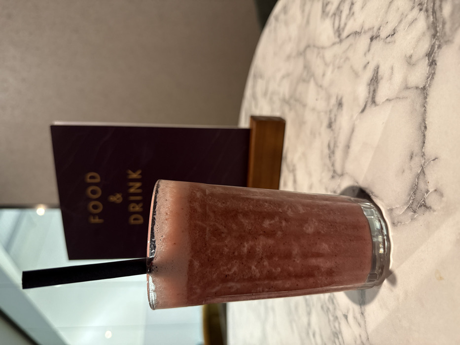 - "A tall glass containing a reddish-pink blended beverage with a frothy top layer and a black straw is positioned on a round table with a white marble surface featuring grey veining" by FM-H3TWA2, licensed under CC BY 4.0