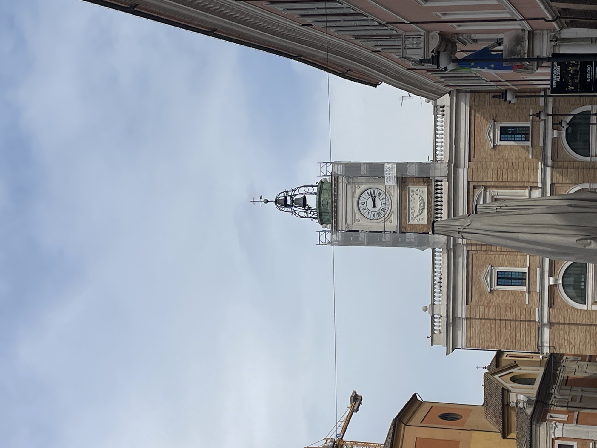 street view in Ravenna, Italy, dominated by the clock tower in Piazza del Popolo. The tower features a clock face and a decorative crown at the top, partially obscured by scaffolding. Buildings frame the sky with their architecture, including window designs, cornices, and rooftops. An Italian flag and a promotional sign can be seen on one of the buildings. A construction crane is visible amidst the buildings. An umbrella shade partly obstructs some architecture. The sky is overcast.