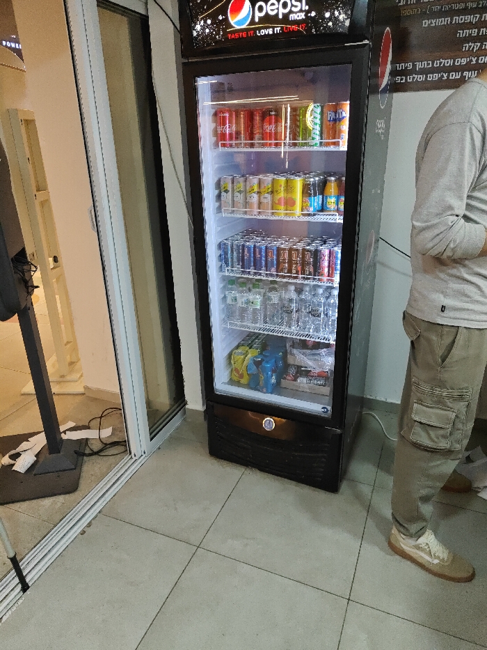 The scene depicts an interior view within a commercial establishment, specifically within the Mate Asher Regional Council, Israel. A tall, black commercial beverage refrigerator with a glass display door is centrally positioned. The top panel of the refrigerator features a "Pepsi max" logo with the tagline "TASTE IT. LOVE IT. LIVE IT." The refrigerator's interior is brightly illuminated, showcasing four shelves fully stocked with various canned and bottled beverages. The top shelf holds rows of Coca-Cola, Sprite, and Fanta cans. The second shelf contains smaller, varied-colored cans and a few small juice bottles. The third shelf is filled with rows of blue, silver, and brown cans. The bottom shelf holds numerous clear plastic water bottles and several multi-packs of beverages in plastic wrapping, alongside a cardboard box. A circular illuminated display is visible on the lower front panel of the refrigerator. To the right of the refrigerator, a person is standing, partially visible from the torso down. The individual is wearing a light grey long-sleeved shirt, light brown cargo pants with a prominent pocket on the left thigh, and light-colored sneakers with tan soles. Their posture is relaxed, with arms possibly crossed or resting at their side. To the left, a segment of a white-framed glass sliding door or window is visible. Near the base of this frame, a dark, vertical metal stand with a rectangular base is present, with white paper scraps or receipts scattered on the light grey tiled floor around it. An electrical cord runs along the floor from the vicinity of the refrigerator towards the left. The tiled floor features distinct grout lines. In the background, behind the person and to the right of the refrigerator, a light-colored wall is visible with partially obscured Hebrew text, indicative of a sign or menu.