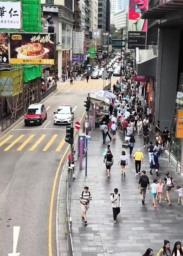 busy street in Hong Kong from an elevated perspective. Pedestrians crowd the wide sidewalk on the right, while a few cars navigate the road on the left. Buildings line both sides of the street, adorned with large advertisements and billboards. Scaffolding covers part of a building on the left. People are walking in various directions, some individually and others in groups. A small kiosk stands near the crosswalk. The weather appears to be sunny.